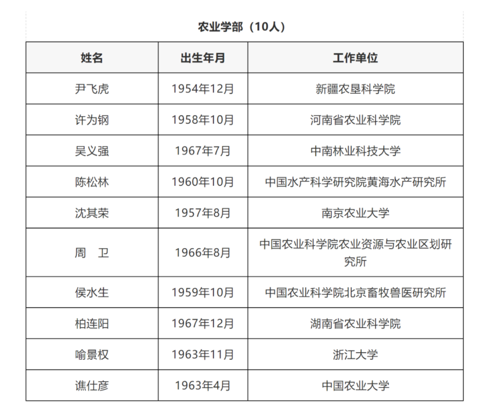 中國工程院農業學部當選院士10人,分別為新疆農墾科學院尹飛虎,河南省農業科學院許為鋼,中南林業科技大學吳義強,中國水產科學研究院黃海水產研究所陳松林,南京農業大學沈其榮,中國農業科學院農業資源與農業區劃研究所周衛,中國農業科學院北京畜牧獸醫研究所侯水生,湖南省農業科學院柏連陽,浙江大學喻景權,中國農業大學譙仕彥。